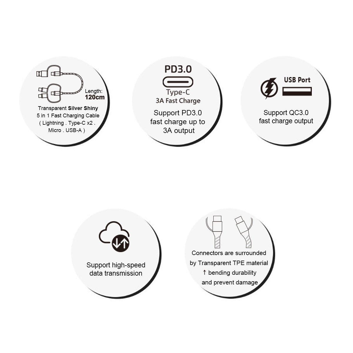 - Transparent silver shiny 5 in 1 Lightning/ Type-C/ Micro to USB-A/ Type-C Data Charging Cable, the length of the cable is 1.2M.