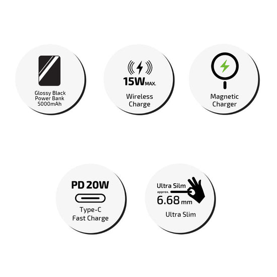 - The thinnest 5000mAh (approximately 6.68mm) glossy black magnetic wireless fast-charging power bank in Hong Kong, allows you to charge your phone wirelessly without interfering its use.