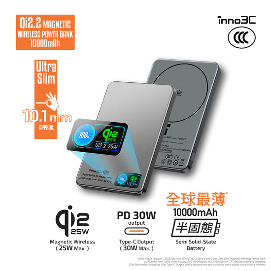 Note: *As of January 1, 2026, the inno3C M17 qi2.2 Semi-Solid-State Ultra Slim Magnetic Wireless Power Bank, 10,000mAh Semi-Solid-State battery, CCC certification, qi2.2 certification, TFT display, magnetic charging, 25W fast wireless charging, 30W Type-C Output, with a lanyard hole and a durable metal casing is the world’s thinnest.