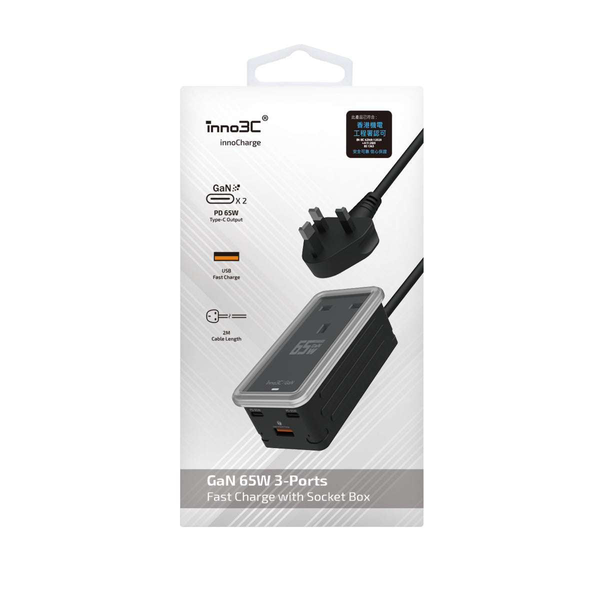 - inno3C GaN 65W 3 Ports Fast Charge with Socket Box