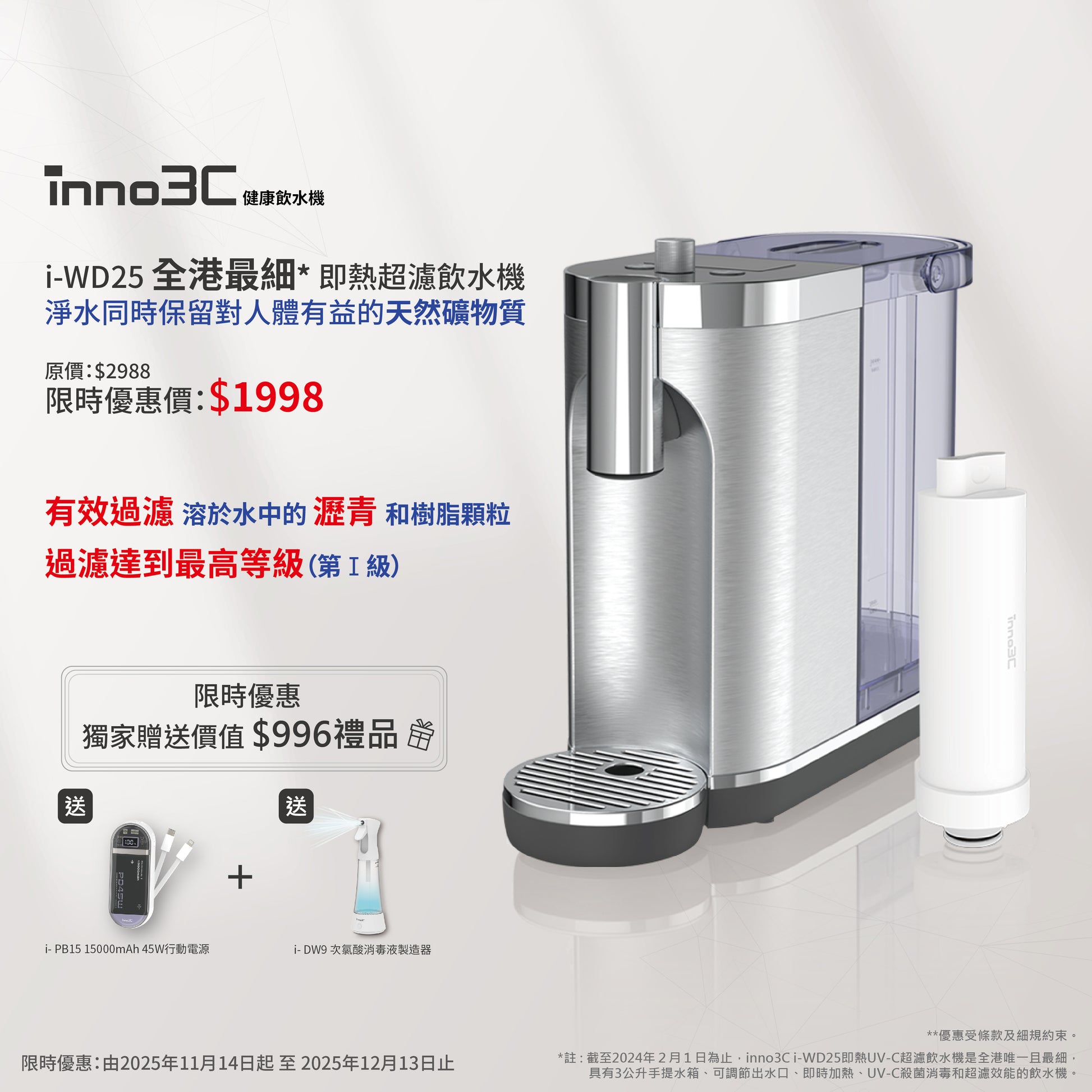 *Note: Until February 01, 2024, the inno3C i-WD25 Instant Heating UV-C Ultra-Filtration Water Dispenser is the only and smallest in Hong Kong with a 3-liter portable water tank, adjustable water outlet, Instant Heating, UV-C sterilization and Ultra-Filtration performance."