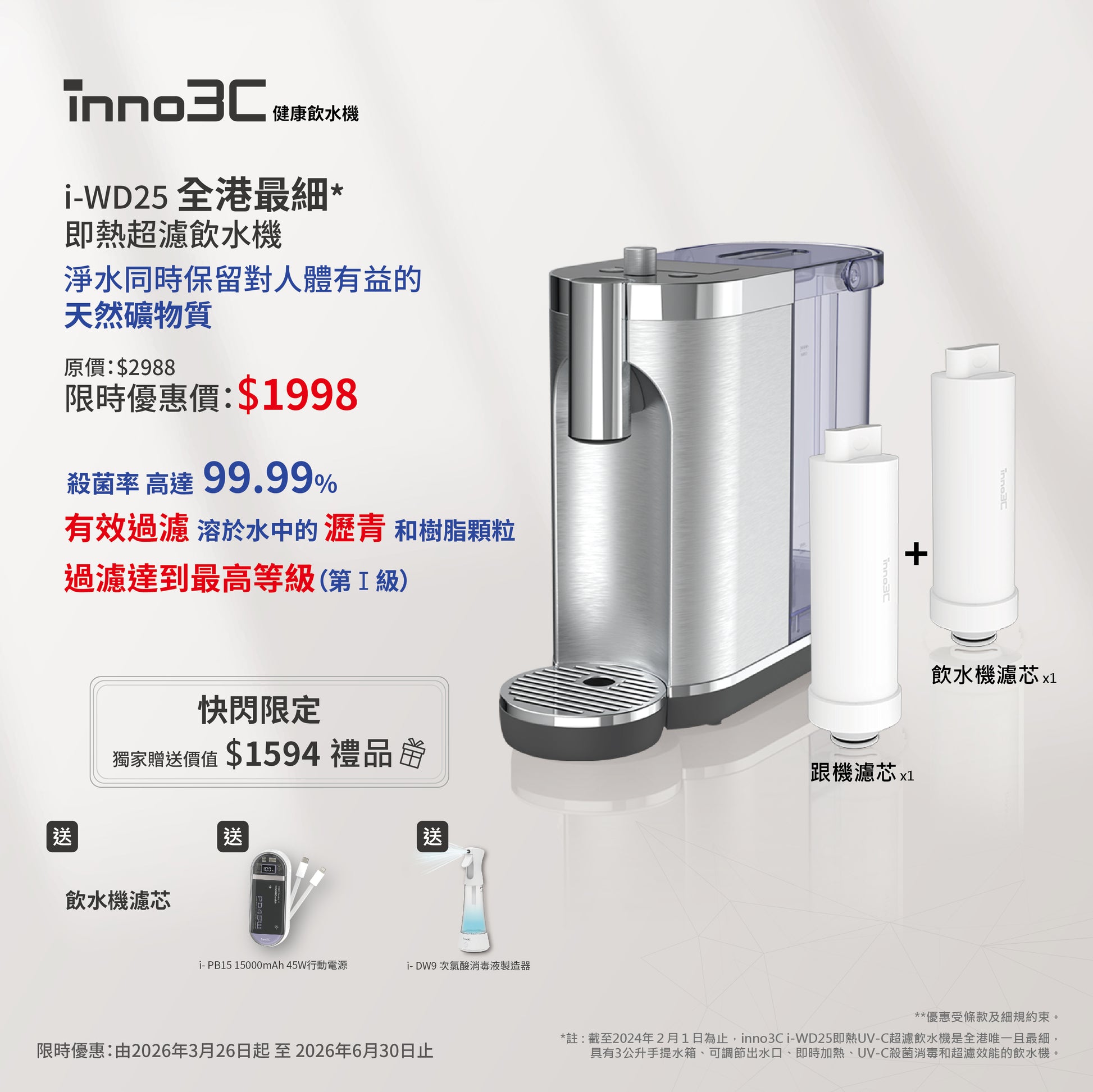 *Note: Until February 01, 2024, the inno3C i-WD25 Instant Heating UV-C Ultra-Filtration Water Dispenser is the only and smallest in Hong Kong with a 3-liter portable water tank, adjustable water outlet, Instant Heating, UV-C sterilization and Ultra-Filtration performance."