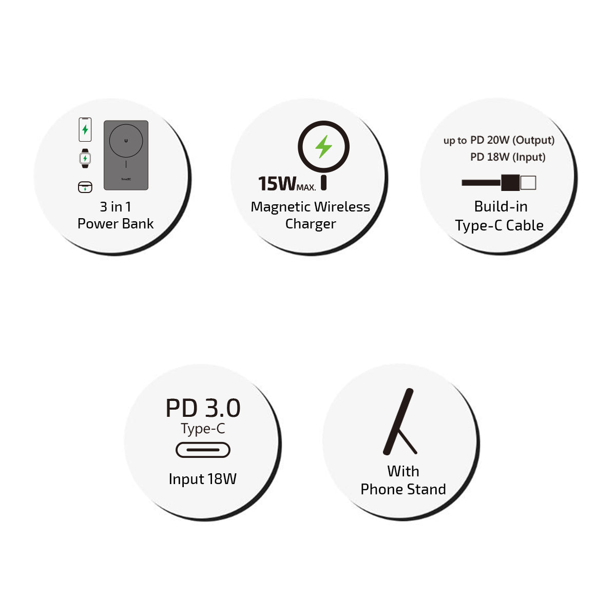 inno3C 3 in 1 內置Type-C線 帶支架 無線充電 磁吸行動電源 i-MD5|迷你磁吸無線充電移動電源 |PD3.0 磁吸充電 移動電源|快速充電 尿袋|無線充電 充電寶