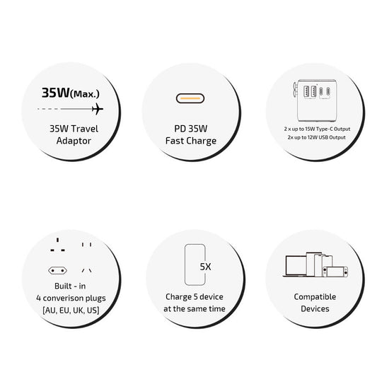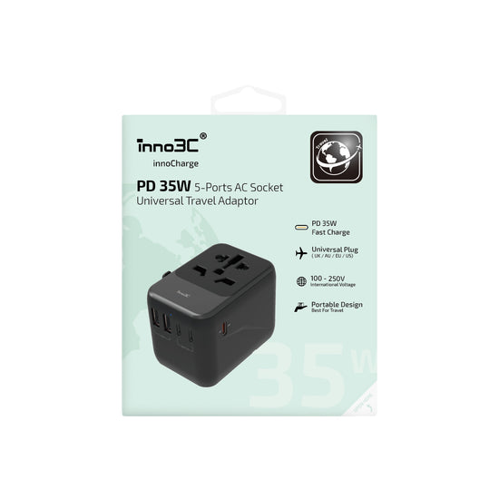 inno3C - PD 35W 5輸出旅行轉換插頭 i-FT35|Type C USB 旅行轉插|快充通用旅行轉插 5 Port (3C2A)|全球旅行通用萬用 轉換插頭|快充充電插座|旅行充電器|伸縮插蘇|快充火牛