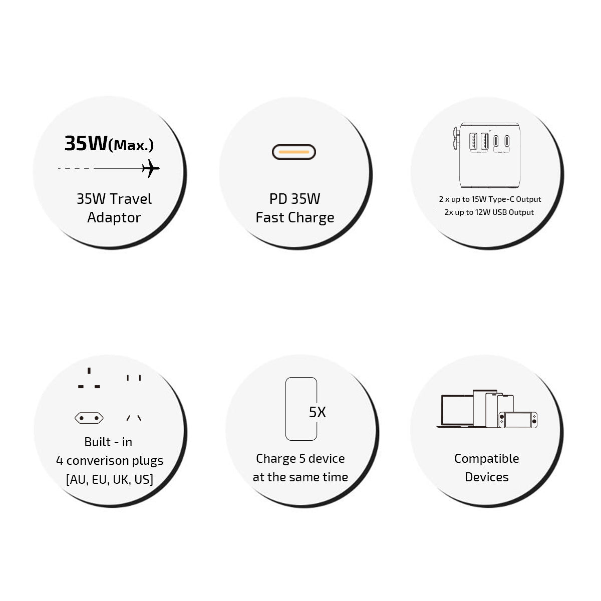 - 1x支持最高35W Type-C快充輸出,配備Power Delivery (PD3.0),並支持最新的MacBook / iPad / iPhone / Android Phone / Switch 和其他快速充電設備。