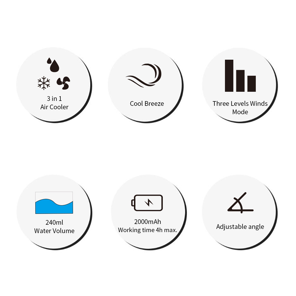 - 內置2000mAh容量,長達約4小時持續出風。