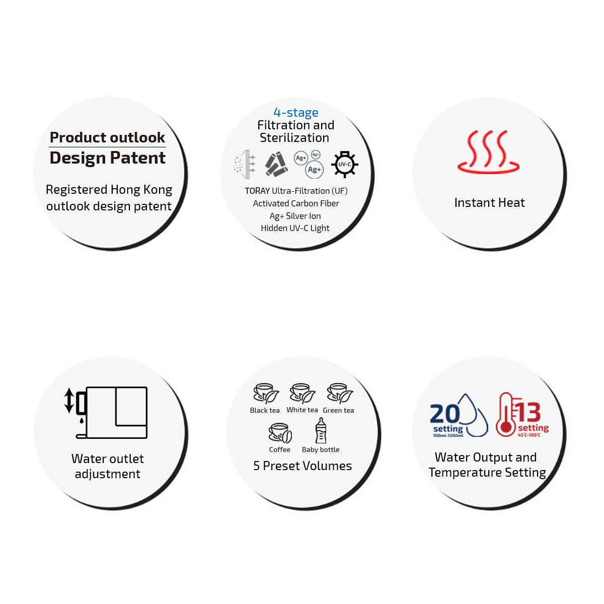 - 5種預設熱水沖泡選項 : 分別有紅茶、咖啡、白茶、綠茶、嬰兒沖奶 5種預設,經已預設出水量及水溫,隨時按所需去選擇選項。